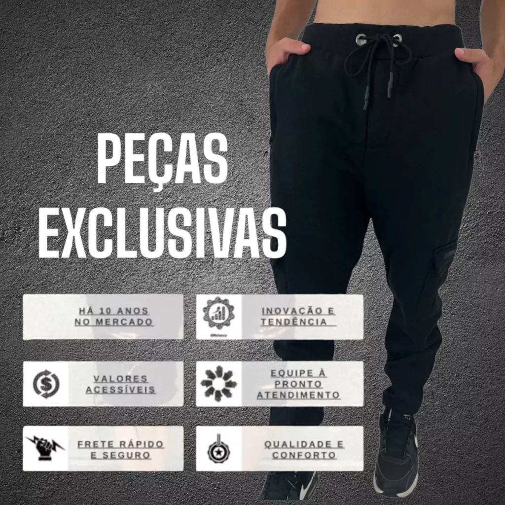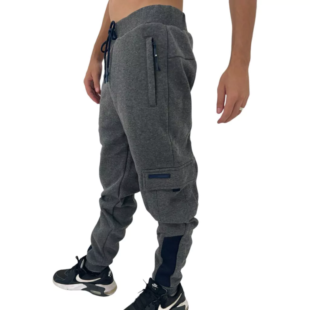 CALÇA MOLETOM MASCULINA CARGO ELA TEM 2 BOLSOS COM ZIPER 2 BOLSOS NA LATERA COM BOTÃO ENGATE RAPIDO COM ELASTICO NA CINTURA COM CORDÃO NA CINTURA NA PARTE DA PERNA TEM UM DETALHE DE TELINHA NA PARTE DE TRAZ TEM A MARCA GANGSTE ENBORRACHADA